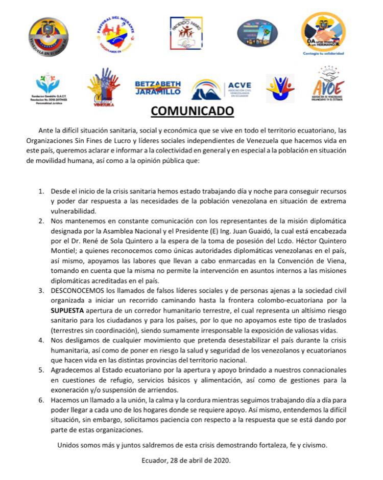 Ante la difícil situacion sanitaria, social y económica que se vive en todo el territorio ecuatoriano, las organizaciones sin Fines de Lucro y líderes sociales independientes de Venezuela que hacemos vida en este país, queremos aclarar e informar a la colectividad en general y en especial a la población en situación de movilidad humana.
