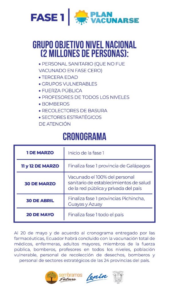 1. El proceso de vacunación será universal y gratuito para la población ecuatoriana (ecuatorianos y residentes).
