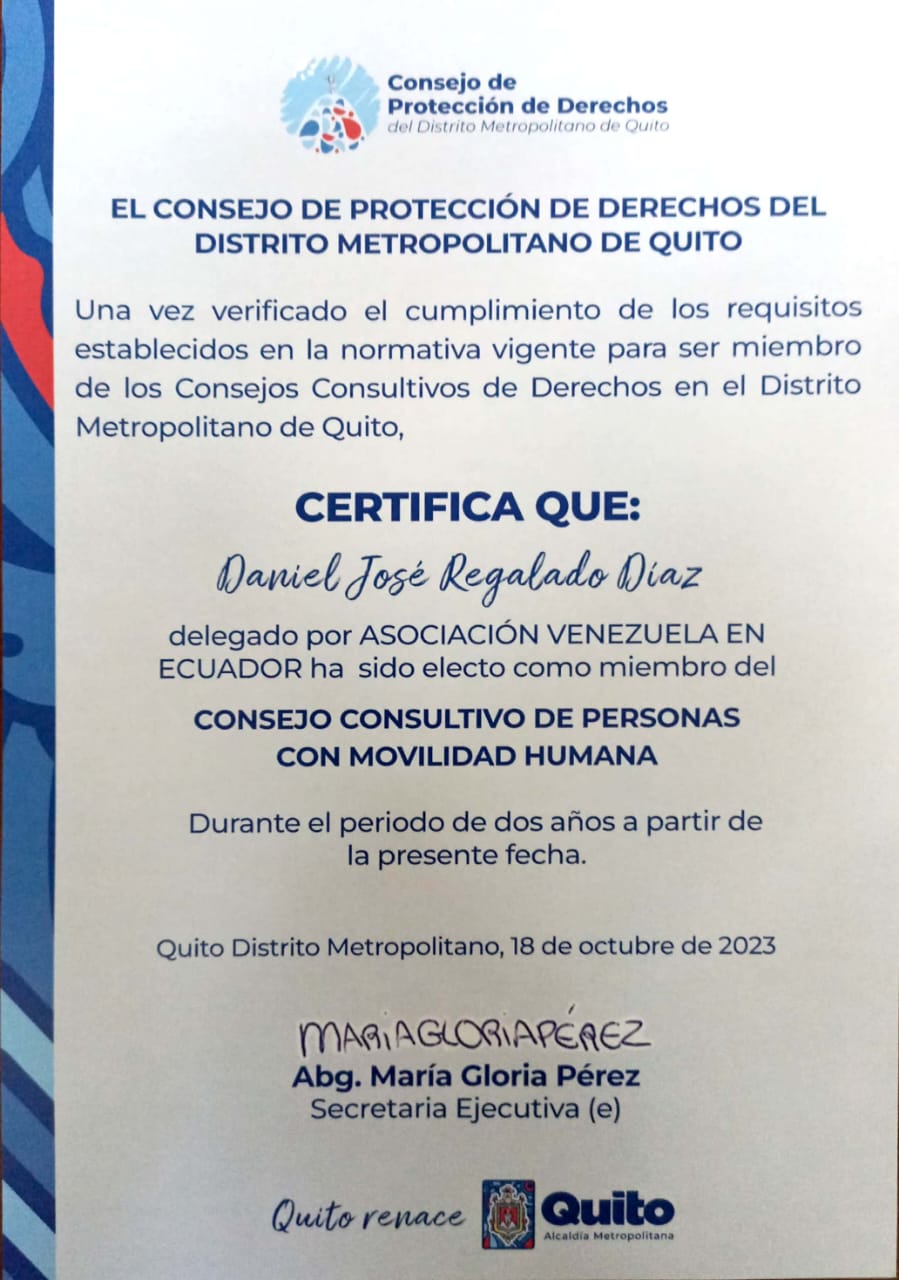 • Insumos al Consejo Consultivo de los Derechos Humanos y de la Naturaleza para el Distrito Metropolitano de Quito en el tema de movilidad humana, alterno de la mesa por organizaciones.